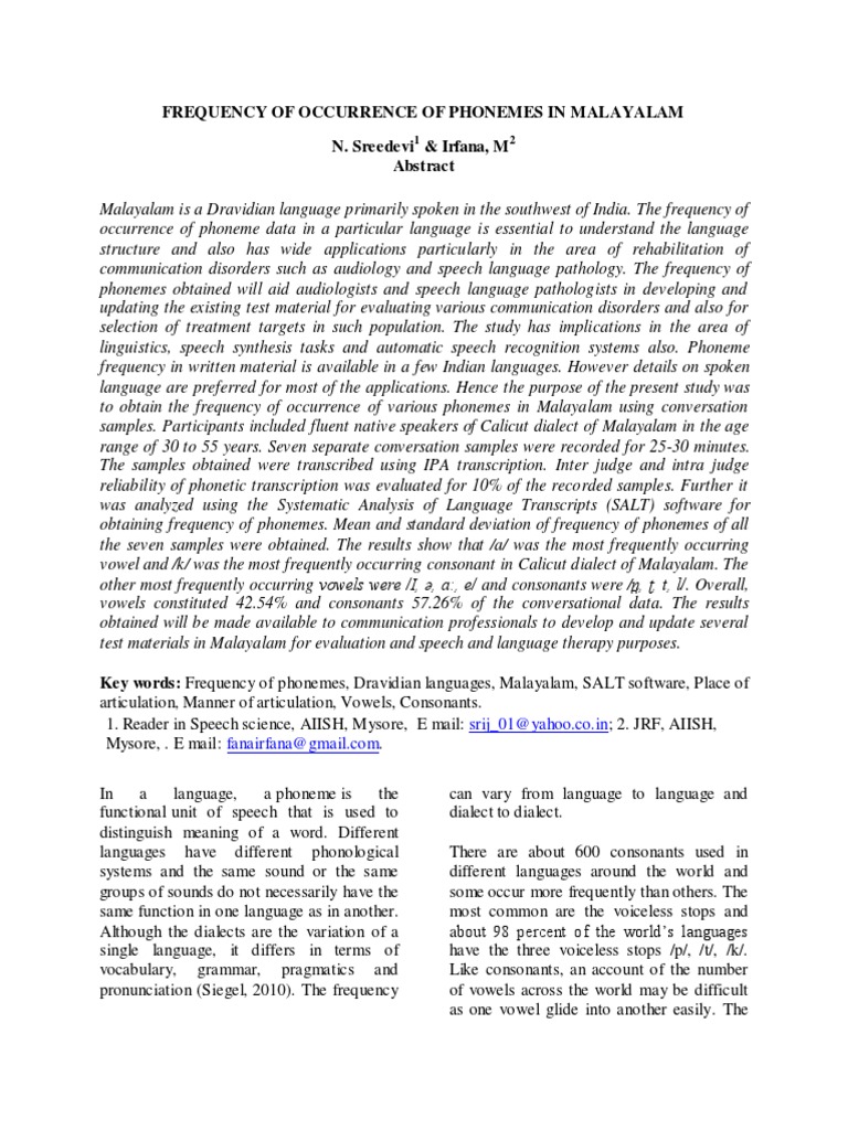 Frequency Of Occurrence Of Phonemes In Malayalam Consonant Phoneme
